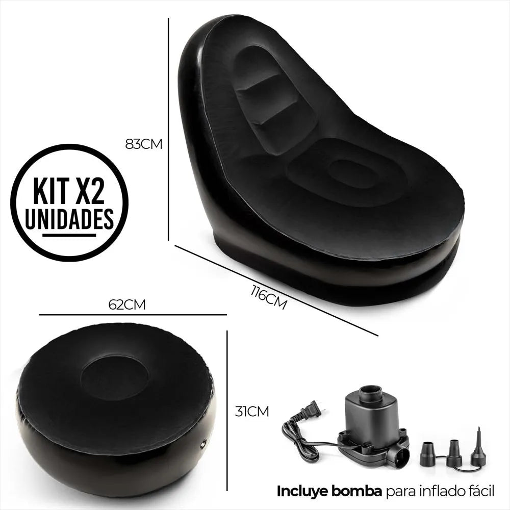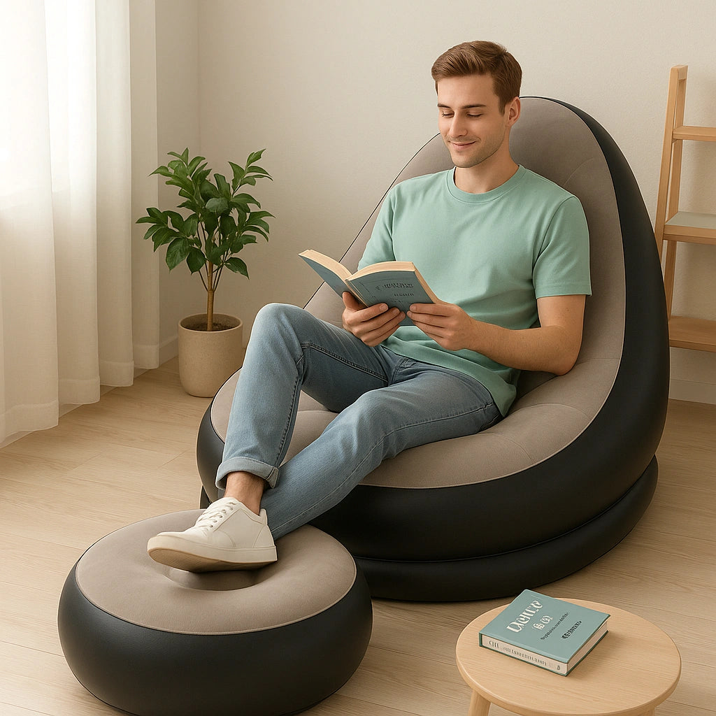 Te presentamos el SILLÓN INFLABLE con Puff, una revolución en diseño portátil, ergonómico y ultra cómodo. Este sillón no solo se ve bien, ¡se siente mejor!